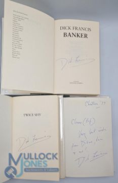 Dick Francis Signed Books and a Letter: some 1st editions, a collection books to include Wild Horses 1994 5th, Decider 1993, Shattered 2000, Whip Hand 1979, Twice Shy 1981, The Sport of Queens 1971 2nd and 1968 1991 3rd, Risk 1977, High Stakes 1975, A Racing Life 1999, Three Winners 1977 2nd, Lester 1986, Great Racing Stories 1989, Dick Francis Steeplechase Jockey 1994, Three Favourites 1978, Banker 1982, Under Orders 2008, plus a letter date 2001, all H/b (19)