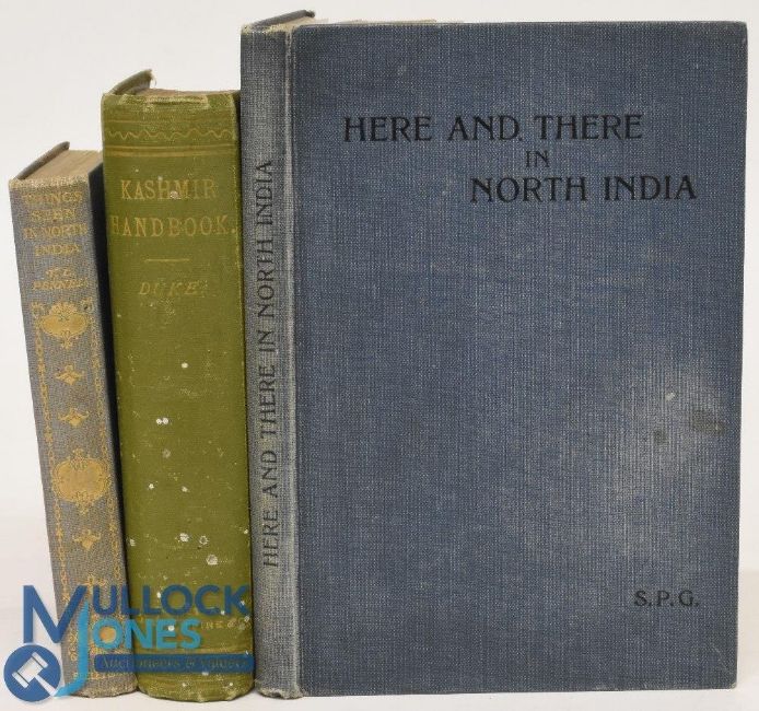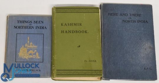 India Books (3) to incl a scarce Kashmir and Jammu A Guide for Visitors by Joshua Duke. Printed by Thacker, Spink and Co, Calcutta 1903. Extensive 613 page guide book with photographs, fold out plans and maps. Fully detailing tents, items to bring, servants and bearers, places to visit with distances and hours of travel to each. Local history and topography etc. In cloth board binding, Things Seen in Northern India by T L Pennell c1910, 154 page book with 34 photographs and illustrations. Detailing places to visit and life in India at that time. In cloth board binding with pictorial gold tooled illustration on front cover. Here And There in Northern India c1914, 99 page book with 32 photographs detailing their schools and teaching life in India at that time, in cloth board binding