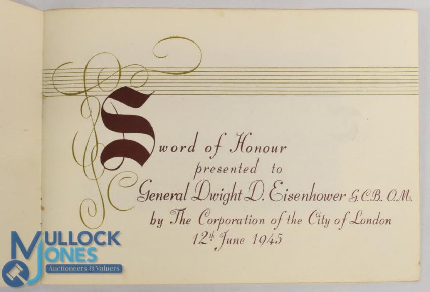 "Sword Of Honour Presented to General Dwight D Eisenhower by The Corporation of London" 12th June 1945, a fine 4-page souvenir programme only given to those invited to this special event, has tipped in photograph of the sword. Printed on quality art paper in card cover, size 8½" x 6"