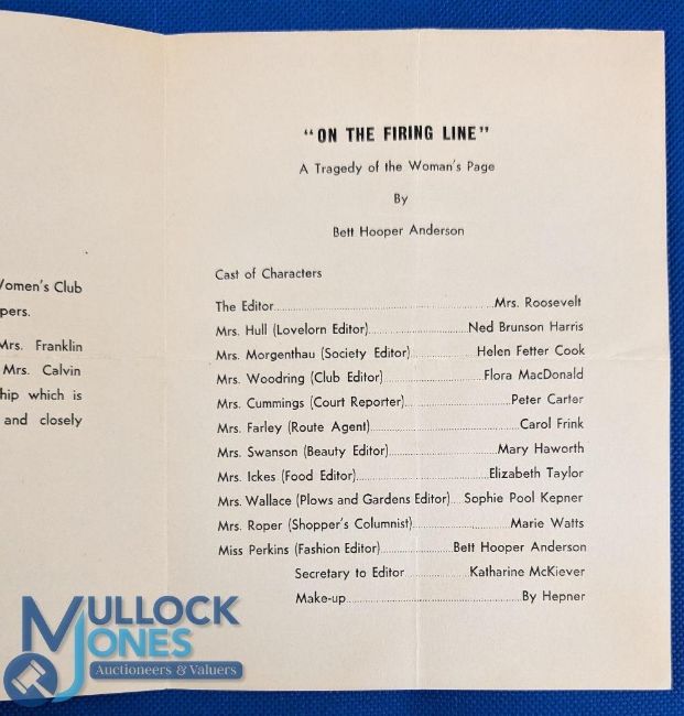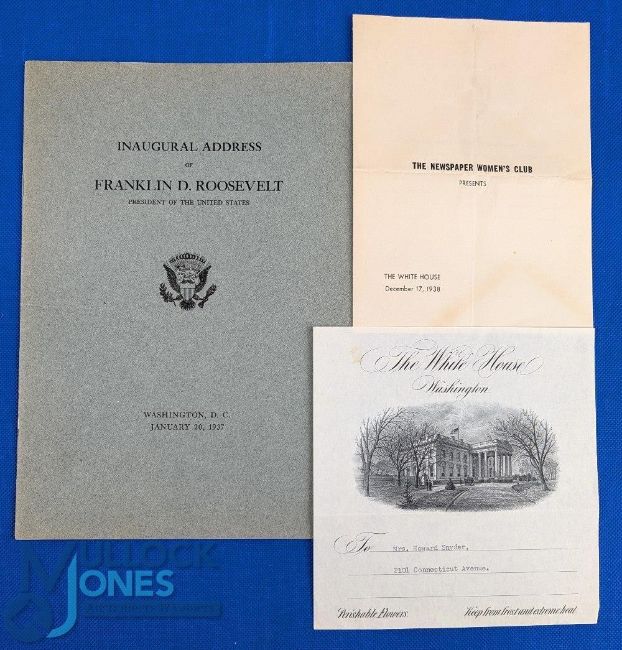 1937 American Presidential Collectables -The Inaugural Address of Franklin Delano Roosevelt, Thirty-Third President of The United States Roosevelt, Franklin D 20th January 1937 booklet, from a very limited edition of 100, comes with The White House Presidential printed paper sent with perishable flowers to a Mrs Howard Snyder - undated and White House Newspaper Women's Club Dec 17 1934 "On the firing line" play programmes with Mrs Roosevelt cast as the editor