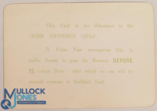 Admission Card to The Irish Chamber at the Guildhall for The Reception of the Emperor and Empress of Germany, July 10th 1891. Printed card with the name of the attendee in manuscript. 6¼" x 4½"