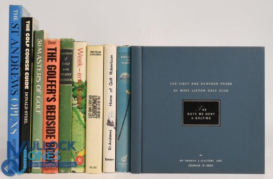 Selection of Golf related books: Weekend Golfer, The Best of Henry Longhurst On Golf and Life, Knave of Clubs Five Up 'Laddie Lucas', The Golf House Club, Elie (signed by the author), St. Andrews Home of Golf, A Round of Golf with Tommy Armour, 50 Masters of Golf, The Golfer's Bedside Book, signed - The First One Hundred Years Of West Linton Golf Club The Days We Went A-Golfing (signed by Gray and Slattery), The Golf Course Guide SB and The St Andrews Open - mixed condition A/G overall (12) box