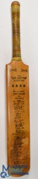 Cricket - an old Cricket Bag with three stumps, a pair of leather shoes, a ball and a small cricket bat with printed signatures of the England and Australian teams from 1948, good condition with some small wear