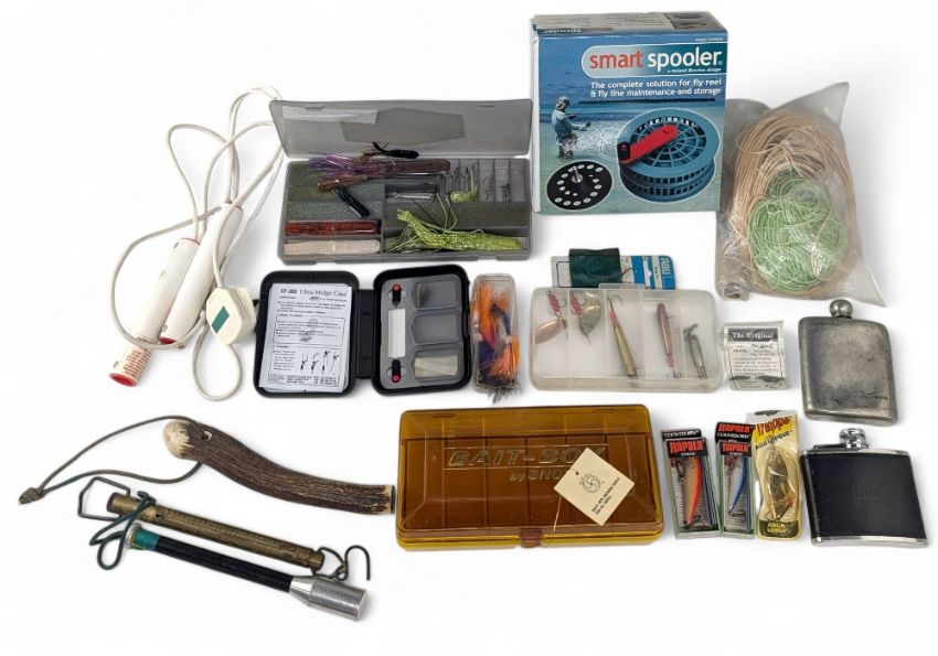 Fishing Tackle: a good mixed collection to include a bait box with unused Rapala and Mepps lures, plugs, 2x hip flasks, C & F design fly box, rubber lures, untested Welliware set, fishing lines, used priest - metal and antler, and a smart spooler tool
