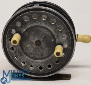 Wallace Watson Patent No. 136217 alloy drum casting reel, 4" diameter, twin white handles with casting trigger knob and side lever check, 3 backplate and 1 rim control, 85mm smooth brass foot, scarce model, retains good original finish