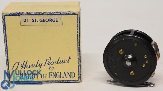 Scarce Hardy "The St George" 2 9/16" alloy trout fly reel, RHW, good smoke agate line guide, in Hardy patent nickel frame, black handle, 2 screw latch, internally stamped "Brit Pat 658472", correct ribbed alloy foot and rim tension regulator, the reel is in superb condition, retains 95% original finish, c/w good clean MOB
