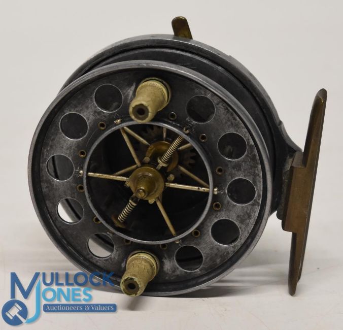 Early Allcock Aerial 3 ½" diameter trotting reel, twin crazed bottle handles, 6 spoke with tension adjuster, side lever check, smooth brass foot, reel spins true and well, retains good lead finish