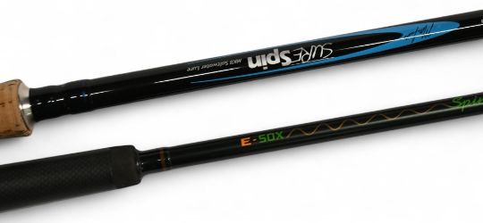 Mike Ladle Sure Spin Mk II saltwater carbon spinning rod Model No SS-SL110 2HS, 11ft 2pc, 25" handle, Fuji uplocking reel seat, lined stand off rings throughout, cloth bag. Very light use. Drennan E-SOX Spinflex carbon spinning rod, 8ft 2pc, 2 lb, CW 8-30g, 19" cork/composite handle, uplocking reel seat, lined stand off rings throughout. Cloth bag, very light use