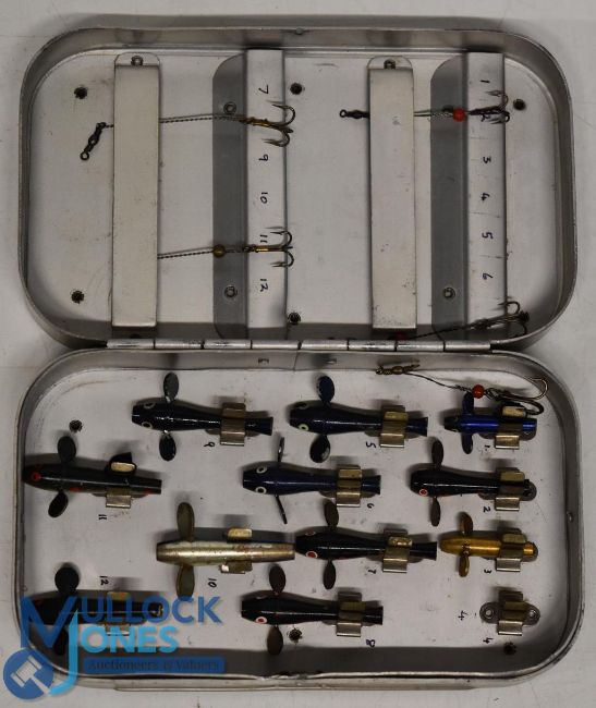 Wheatley alloy pocket lure and fly box, 6" x 3 1/2" x 1 1/2", opens to show alloy covered cork strips to the underside of the lid and a series of spring steel clips opposite holding a small collection of hand painted minnows with mounts