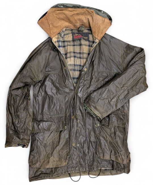 Vintage Belstaff wax Jacket Fishing Hunting, with hood a few age-related holes to pockets, size #40" chest