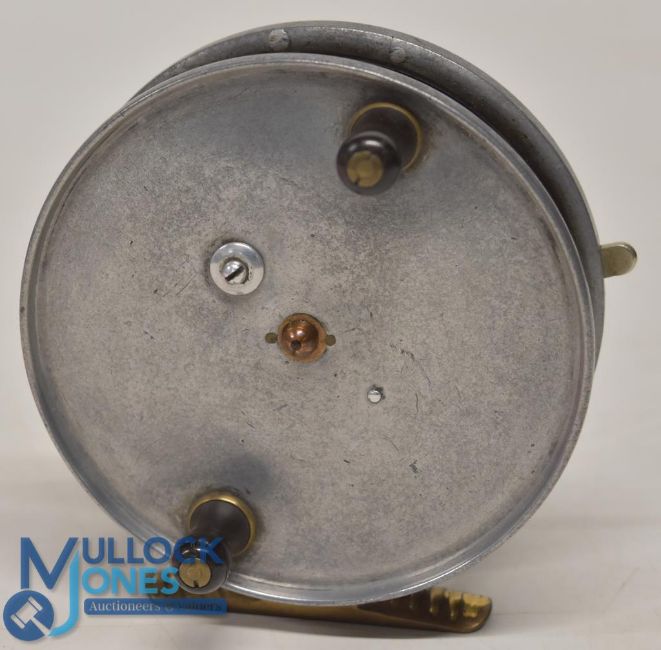 Scarce Hardy "The Wallis" 4" centrepin reel, shaped handles, button spool release, side lever check, alloy Bickerdyke line guide, correct ribbed brass foot, reel spins true and well, good example