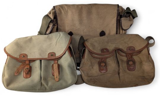 2x Brady canvas and leather trimmed Fishing Bags, both with webbing shoulder straps, two front pockets, both have a waterproof liner - plus an unbranded fishing bag canvas and synthetic leather finish. All with age related wear, F-G (3)