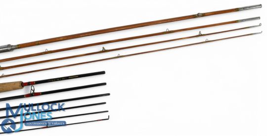 Shakespeare "Deluxe Travel Fly" 1717-285 carbon trout fly rod, 2.85m, 6pc line 6/7#, uplocking reel seat, lined rings, MCB with screw top tube with shoulder strap. Very light use. Unnamed split cane fly rod, 9ft 3pc with spare tip, alloy reel set, cloth bag. (2)