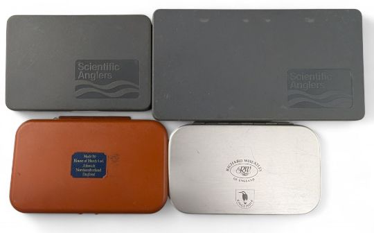 Hardy Bros Fishing Rod Bags, plus a Sage rod bag and two unbranded bags, reel bag, a collection of salmon flies singles, doubles and trebles in fly boxes made by Hardy, Scientific Angler, Richard Wheatley (one Hardy has a broken clip)