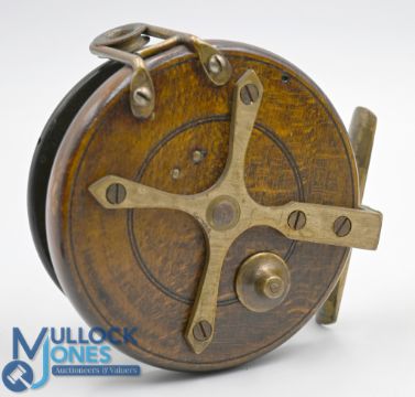 Rare Coxon Aerial reel, 3-1/2" ebonite drum stamped Patent. 4 spoke see through drum, tension regulator, twin white handles. Brass line guide, starback, on/off check button reel turns straight, smooth and well, fine example.