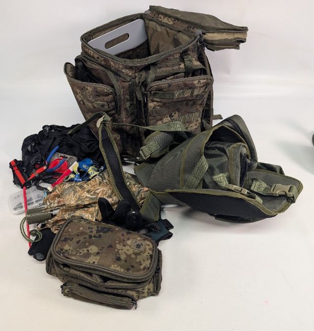 Thinking Fishing Camfleck Rucksack - multi pockets, with a matching tackle bag, plus accessories - umbrella, lead shot tools, Roddarch waistcoat, in good clean condition