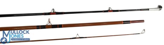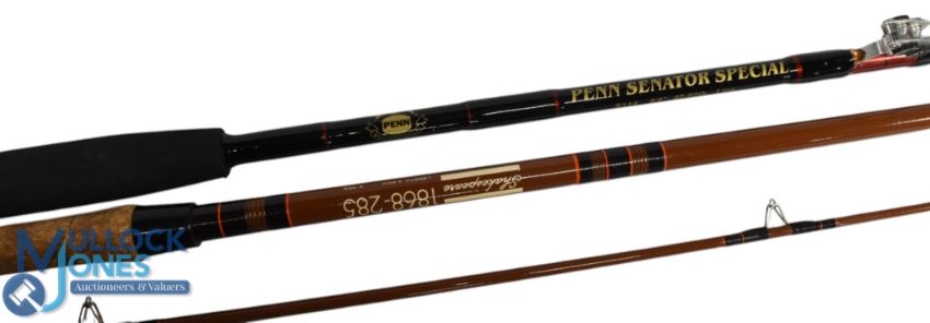 A fine PENN Senator Special S114 carbon boat rod, 6ft 6" 1pc, 40-60 lb line, 25" composite handle, uplocking reel seat, Stuart Roller butt/tip rings, cloth bag. Looks unused. Shakespeare 1868-285 match rod, 2.85m 2pc, 24" handle, alloy sliding reel fittings, lined but/tip rings, cloth bag. (2)