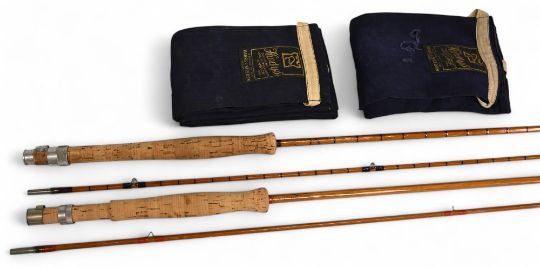 Dawsons of Bromley "The Dawson Wharfe" hand built split cane trout fly rod, 8ft 6" 2pc line 6#, alloy sliding reel fittings, red agate butt/tip rings, Hardy cloth bag. Split cane rod by R Sykes of Penrith 8ft 6" 2pc line 6?#m alloy sliding reel fitting in Hardy cloth bag. (2)