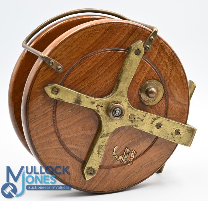 Milward Seafarer 6" Nottingham brass starback reel, central wing nut brake, Bickerdyke line guide, optional check, transfer to backplate, good