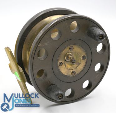 Ebonite & brass 4" starback reel, Slater drum latch, optional check, internal caliper spring, spins well