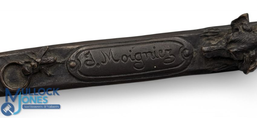 After J Moigniez - bronze paper knife cast with a hound watching a fly, L27cm