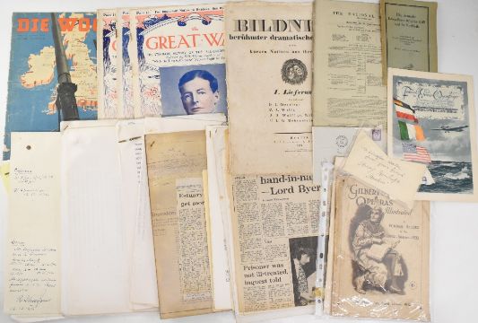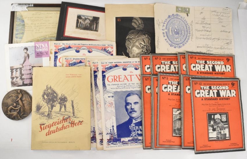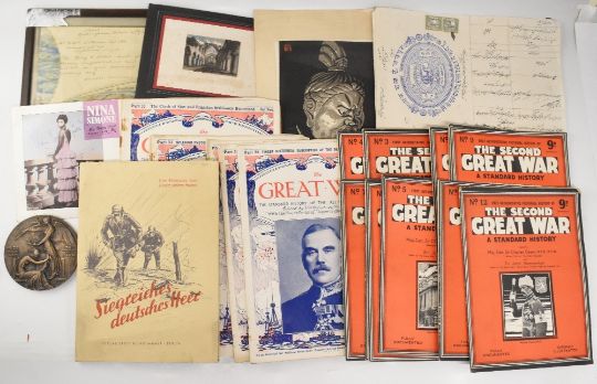 EPHEMERA - carton with a large selection including WW2 and WWI magazines, a framed certificate, prints, a Victorian scrap book, papers relating to plans for gold mining in Wales, some early letters, a Gilbert and Sullivan pamphlet, a printed Act of Parliament for George III relating to the New Forest, a rare 1979 Manchester United 45rpm vinyl single (on red vinyl) etc