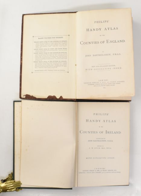 ANTIQUE MAPS - TWO RARE ATLASES - Philips Handy Atlas of the Counties of England, together with Philips Handy Atlas of the Counties of Ireland. Both probably first editions, c 1880s. Slight distressing of covers for the England atlas, but contents fine, Ireland atlas in fine condition.