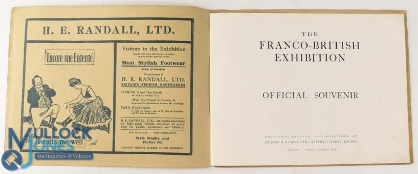 Olympic Games & Franco-British Exhibition Souvenir Brochure 1908 with views of the exhibition. Thin card cover, 22 pages printed on semi-gloss paper with 39 large black and white photographs of the Olympic stadium which could hold 150,000 spectators, plus the ornate and attractive temporary buildings erected specially for the exhibition at White City, and describing text. 10¾" x 8½".
