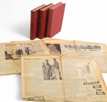 MONTGOMERY OF ALAMEIN - first edition copy of the Memoirs, signed by Montgomery on the front free endpaper, red cloth boards in good condition, together with first edition copies of 'El Alamein to the River Sangro' and 'Normandy to the Baltic' both by Montgomery, with associated press clippings.