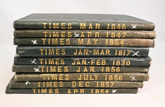 The Times - 9x Quarterly bound vols. 1817, 1830, 1846, 1854 (2), 1856 (2), 1857 - bound in green cloth, gilt title on spine. Good condition