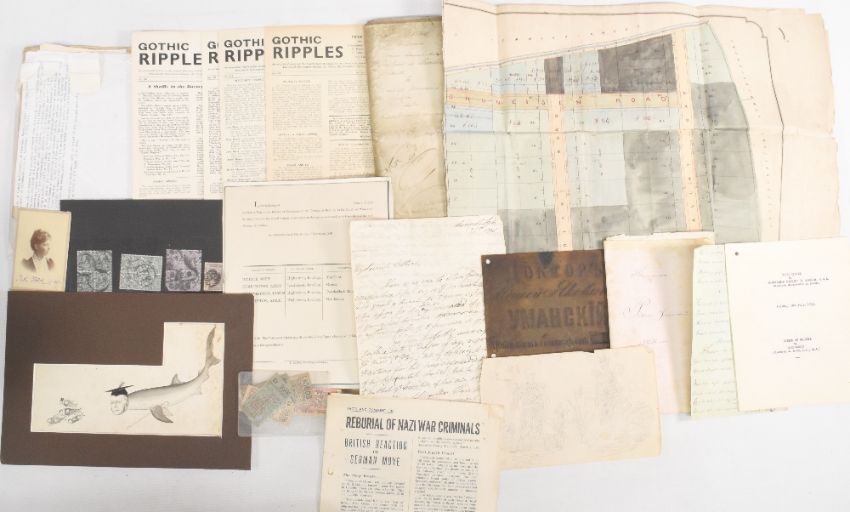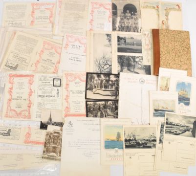EPHEMERA - a carton containing an extensive and diverse collection of ephemera, including letters, documents, albums, two fine early 20th c design brochures, postal history items, publications etc
