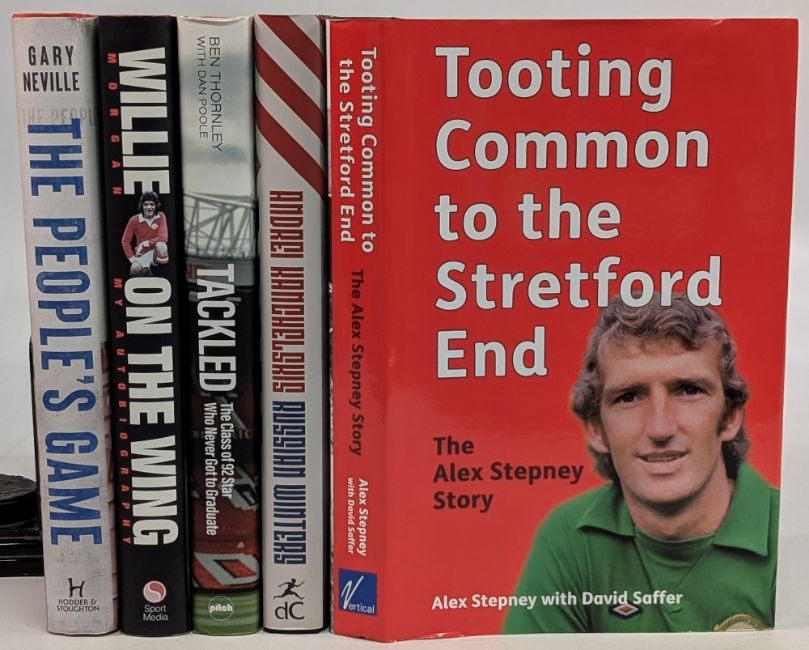 Five Manchester United Signed Books Autographs - Gary Neville The People's Game signed 2022, Willie Morgan On The Wing signed 2013, Ben Thornley Tackled signed 2018, Andrey Kanchelskis signed 2017 first reprint Alex Stepney Tooting Common to the Stretford End signed 1988, all H/b. G