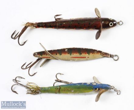 Hardy Bros Spinning lures (3) features 4" brown phantom, 3" fly minnow and another 3 ½" lure, all with maker's marks, treble hooks