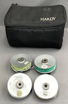 Hardy Bros LRH Lightweight spare spools 3 3/16" ventilated spools, with 2 screw latch and black handle. All in Hardy 3-section zipped reel case