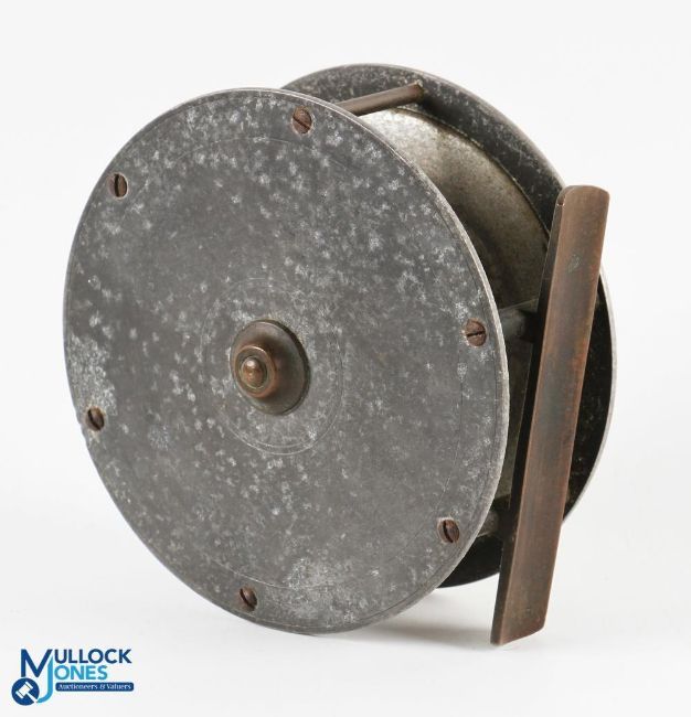 Army & Navy, Makers, 105 Victoria Street, Westminster, Hercules style alloy salmon fly reel 4 3/8", wide spool with ivorine handle, constant check (a little stiff), 4 pillar frame, full brass lacquered foot