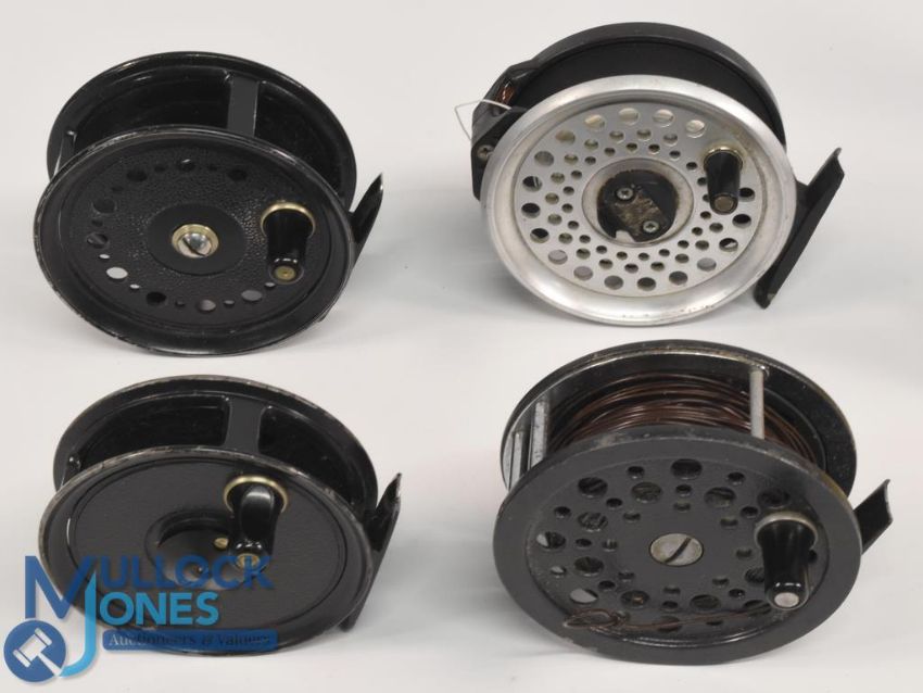 J W Young & Sons "The Condex" alloy trout fly reel 3 ½" wide ventilated spool, constant check, runs well. J W Young & Sons "The Super Condex" alloy fly reel 3 ½" wide ventilated spool, constant check, runs well. J W Young "The Pridex" alloy trout fly reel 3 1/8" solid spool, 2 screw latch, constant check, light wear. Sealey Ltd "Intrepid" fly reel 3 ½" ventilated spool, 2 screw latch, black handle, rear tensioner, constant check, runs okay. (4)