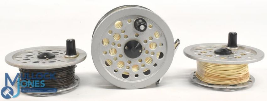 Shakespeare Beaulite salmon fly reel with 2 spare spools, 4 ¼" wide ventilated spool, 2 screw latch, rear tensioner, constant check, runs very well, light use