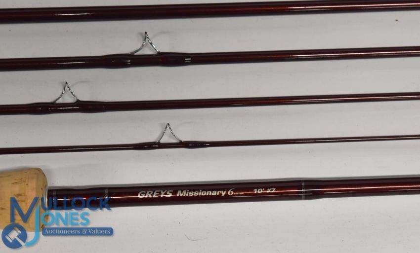 A fine Grey's Alnwick Missionary carbon trout fly rod, Smuggler style, 10ft 6pc, line 7#, double alloy uplocking reel seat and collar with fighting butt, lined stripping rings, MCB and correct zip top Cordura tube. Looks unused