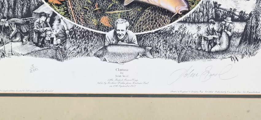 Limited edition John Searl colour print of 'Clarissa' by John Searl, 5lbs 8ozs British Record Carp, taken by Richard Walker from Redmire Pool on 13th Sept 1952. Framed and glazed, 3/250, signed Searl - framed under glass - size #61cm x 66cm