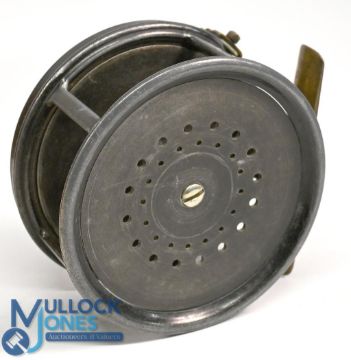Hardy Bros "The Perfect" alloy salmon fly reel 4 ¼" ventilated spool, strapped milled rim tensioner with Turk's head, 1912 check, Eunuch design, ivorine handle, 4 screw smooth full length brass foot, in Hardy Bros brown card trade box