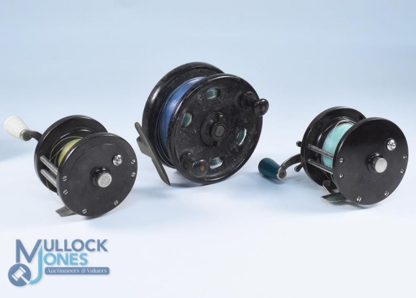 Penn USA 85 Bakelite multiplier counter balanced handle, spindle tensioner, on/off check, runs well; Penn USA 78 Bakelite multiplier counter balanced handle, spindle tensioner, on/off check, runs okay; ELO Bakelite centre pin 4 1/2" ventilated spool, twin handles, central spindle tensioner, on/off check, brass stanchion and reel seat, runs well. (3)