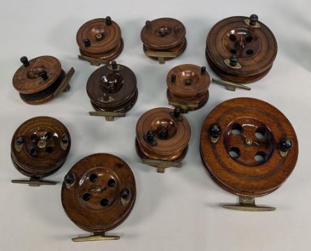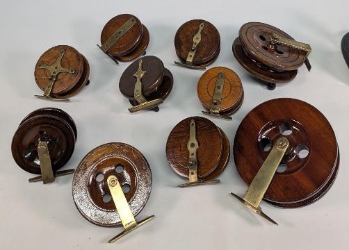 Collection of wooden Nottingham and Scarborough reels, ranging from 4"-6 ½" diameters, including brands Eaton Sun, Allcock, good decorative lot. (Qty)