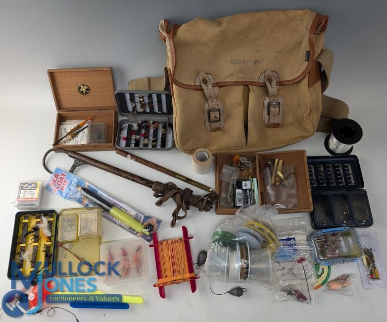 Barbour canvas/leather trout fishing bag, adjustable shoulder strap, brass extending gaff with modified handle, quantity of flies in boxes, spinners and general accessories