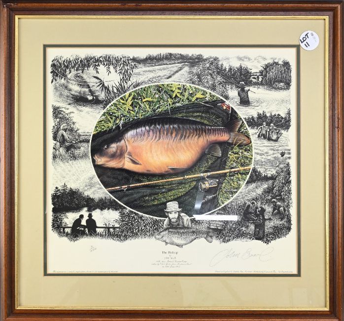 Limited edition John Searl colour print of 'The Bishop' by John Searl, 5lbs 8ozs British Record Carp, taken by Chris Yates from Redmire Pool on 16th June 1980. Framed and glazed, 3/250, signed Searl - framed under glass - size #61cm x 66cm