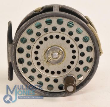 Hardy Bros "The Zenith" alloy sea trout fly reel 3 3/8" wide ventilated spool, 2 screw latch, black handle, milled rim tensioner, 2 screw line guide, alloy foot (slight twist), signs of use, runs well