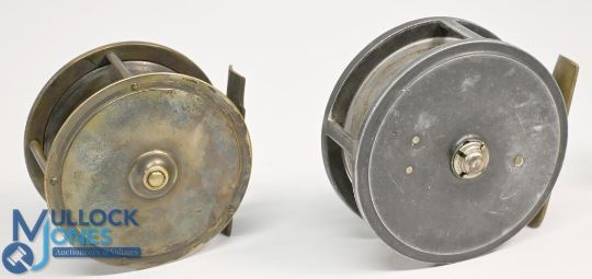 Phin Maker, Edinburgh brass fly reel, 3 ½" wide spool, horn handle, good check, 5 pillar frame, foot tapered, runs well. J Macpherson Inverness alloy fly reel, 4" spool, horn handle, good check, brass foot, light filing one end. (2)