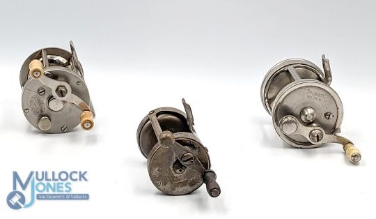 3x Various USA Multiplying Reels - features an A F Meisselbach Tripart No 580 80 yards in chrome finish, counterbalance handle, a South Bend Oreno Anti-Back Lash casting reel No900 with twin handle, on/off check and Portage Topic No123 reel with counterbalance weight - appear A/G overall