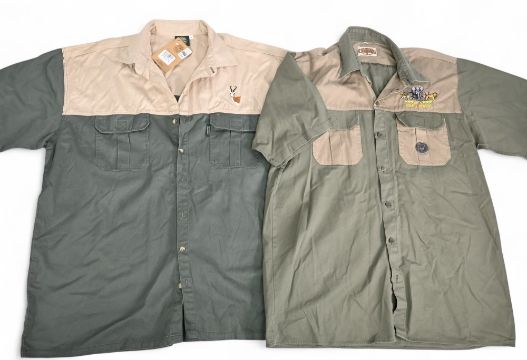 Hunter Shooting Jacket and Shirts, a Bob Allen jacket size L with leather trim, Stevenson Hamilton hunting shirt size XL, Safari original big game shirt XL