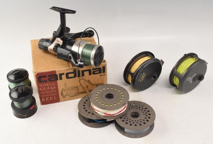 Abu Cardinal 84 fixed spool reel with 2 spare spools, counter balanced handle, good bail, rear tensioner. In box with instructions. Dragon Fly Cartridge 395 disc drag alloy fly reel with spare spool, 3 ¾" ventilated spool, counter balanced handle, rear tensioner, constant check. Rimfly Cartridge 395 alloy trout fly reel with 2 spare spools, 3 ¾" ventilated spool, counter balanced handle, rear tensioner, constant check. In pouch, light use. (3)
