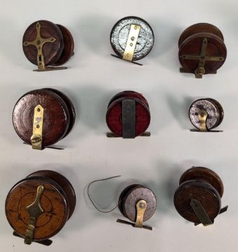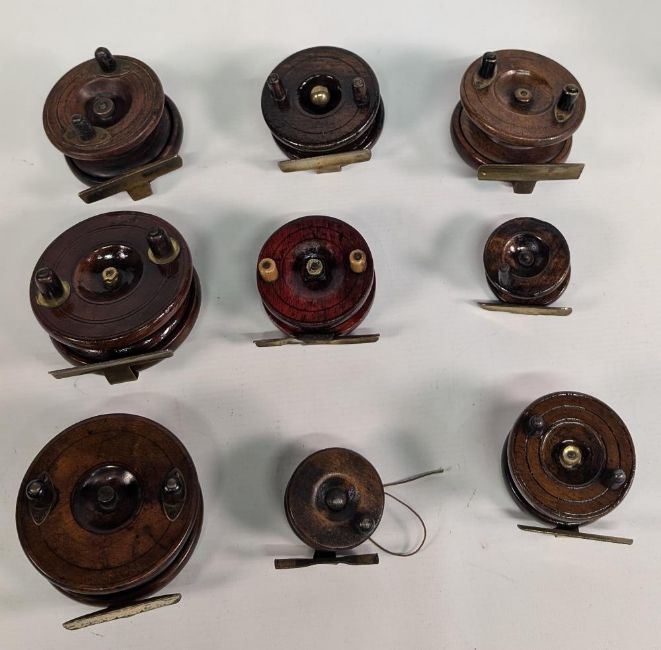 Collection of 10 vintage Nottingham reels, ranging in sizes 2"-3 1/2", starback, spine back and strap back forms, 3 with ratchets, good decorative collection. (10)